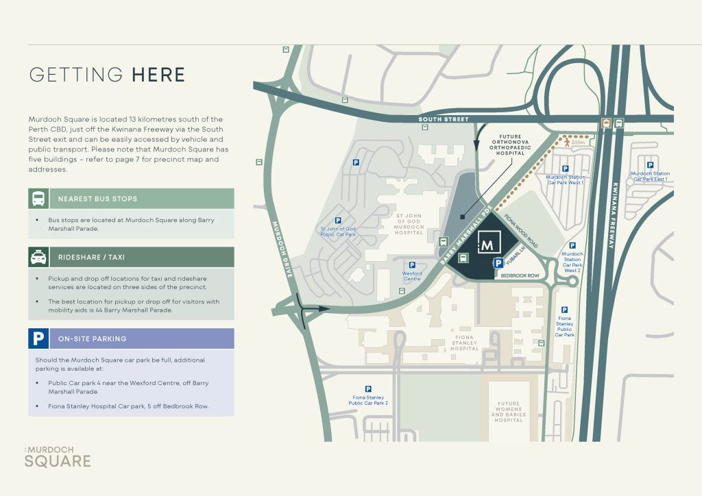 Murdoch Square is located 13 kilometres south of the Perth CBD, just off the Kwinana Freeway via the South Street exit and can be easily accessed by vehicle and public transport.