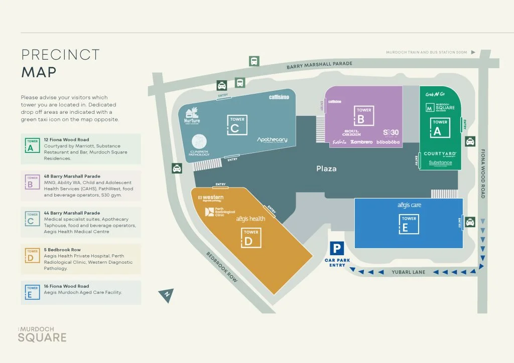 Murdoch Square is WA’s newest mixed-use and health precinct. It houses houses Aegis Health Murdoch, Aegis Care Murdoch, a diverse mix of healthcare specialists, residents, hotel, retail, office workers, and a State-run MediHotel.
